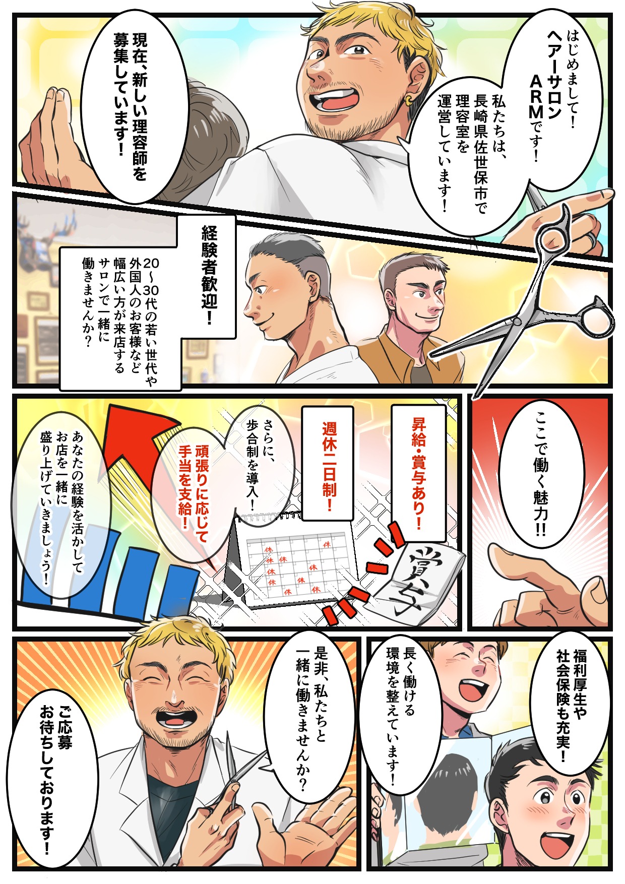 トレンドのフェードカットを武器に、もっと“カッコいいメンズスタイル”をつくりませんか?佐世保市のアームは、20〜30代の男性客が多いメンズ特化の理容室です。ビジネスフェードから攻めたスタイルまで、幅広いオーダーを通して技術を磨ける環境があります。入社後は先輩がマンツーマンでサポートし、フェードカットの基礎から仕上げの細部まで丁寧にレクチャー。ガツガツ売り込むよりも、じっくり技術と接客でファンを増やしていきたい方にぴったりの職場です。技術を伸ばしたい理容師さんのご応募をお待ちしています!